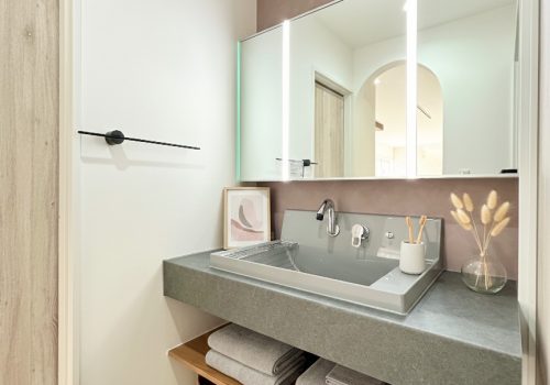 グレーと木目が調和する、シンプルで上質な洗面スペース。