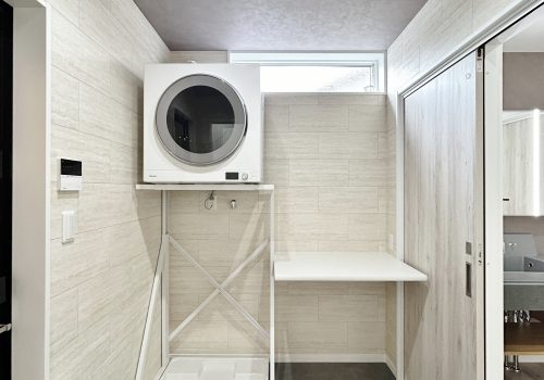 圧迫感を感じさせないよう、明るいタイル調クロスとグレートーンの床材で統一し、清潔感と上質さを両立しています。